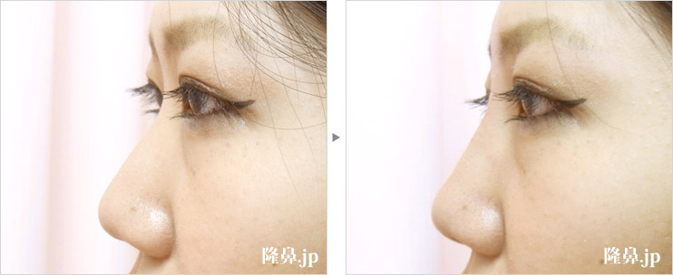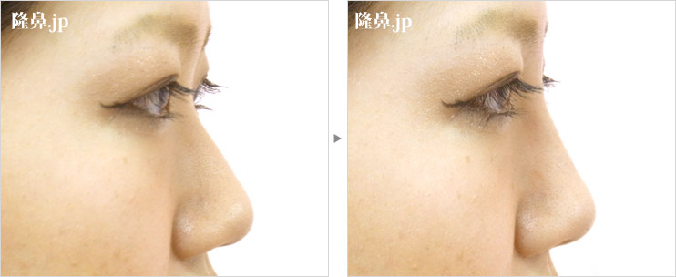 鼻根部が極端に低いために鼻の形が悪く幼稚に見えるので悩んでいた症例です。ダウンタイムが短く手軽なヒアルロン酸鼻注射治療を希望されました。鼻背から鼻根部を直線的になるように修正しました。大人っぽく上品な顔立ちになりました。ヒアルロン酸鼻注射は手軽で腫れの少ない治療法です。高品質の注入用ヒアルロン酸が開発されたために大きく普及しました。ヒアルロン酸鼻注射ダウンタイムの短い素晴らしい方法ですが、時間経過と共にヒアルロン酸が減るために効果が少なくなる、横に広がることがある、ごく稀にアレルギー反応を起こすことがあるなどの欠点があります。特に横に広がるとあたかも整形したように不自然になりますので、経験豊富な美容外科の名医に相談されることをお勧めします。