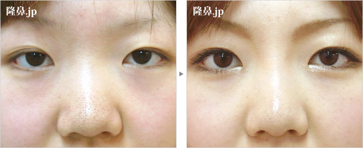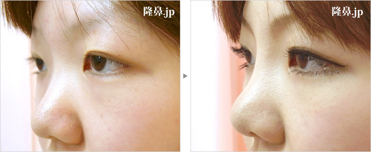 鼻根部が低いのと目と目が離れているために悩んでいた症例です。今回は鼻プロテーゼによる隆鼻手術のみにより、見た目を改善したいと希望されました。自然な形になるように加工したプロテーゼを鼻孔縁切開から挿入しました。幼稚な感じから上品で大人っぽい印象に変わりました。鼻根部が低く目と目が離れている場合は、隆鼻手術と目頭切開を行うのがベストの選択ですが、隆鼻手術のみでもかなり効果を出すことができます。幼稚な感じの顔立ちが上品で大人っぽい印象に変わります。